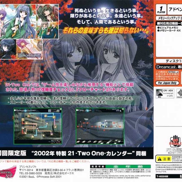 21 Two One is an obscure and intriguing Japan-exclusive title for the Sega Dreamcast, centered around blackjack-inspired puzzles and casino-style gameplay. Rather than a straight casino simulation, the game blends strategy challenges, stylized character interactions, and score-driven progression. Its minimalist presentation and arcade-like pacing make it a unique entry in the Dreamcast’s Japanese library.