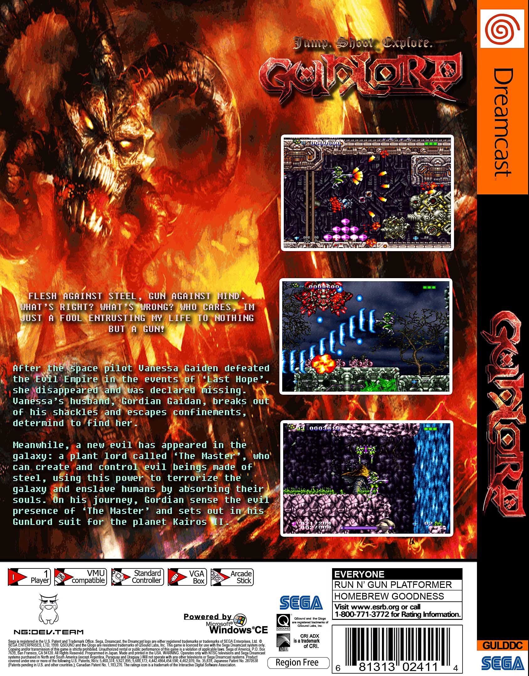 Gunlord brings sprawling, non-linear run-and-gun action to the Dreamcast with nine massive stages, hidden routes, and screen-filling bosses. Built by German indie studio NG: DEV.TEAM, it blends arcade gunplay with exploratory platforming and a thumping synth soundtrack by Rafael Dyll.