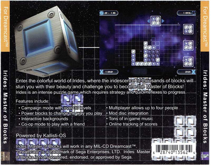 Originally developed by Mad Peet and enhanced by Yuan Works, IRiDES: Master of Blocks was published by Goat Store Publishing during the Dreamcast’s thriving homebrew era. Released nearly a decade after Sega discontinued the system, it stood out for its polish and addictive mechanics.