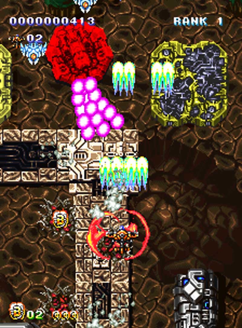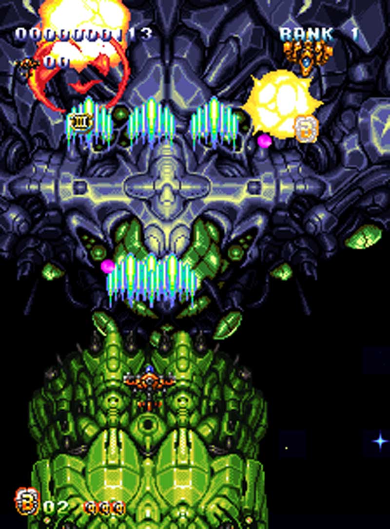 Dodge dense bullet patterns, defeat colossal bosses, and rack up points using the game’s chaining and multiplier systems. Bombs clear the screen in emergencies, but careful use of the scoring system rewards precision and risk-taking.